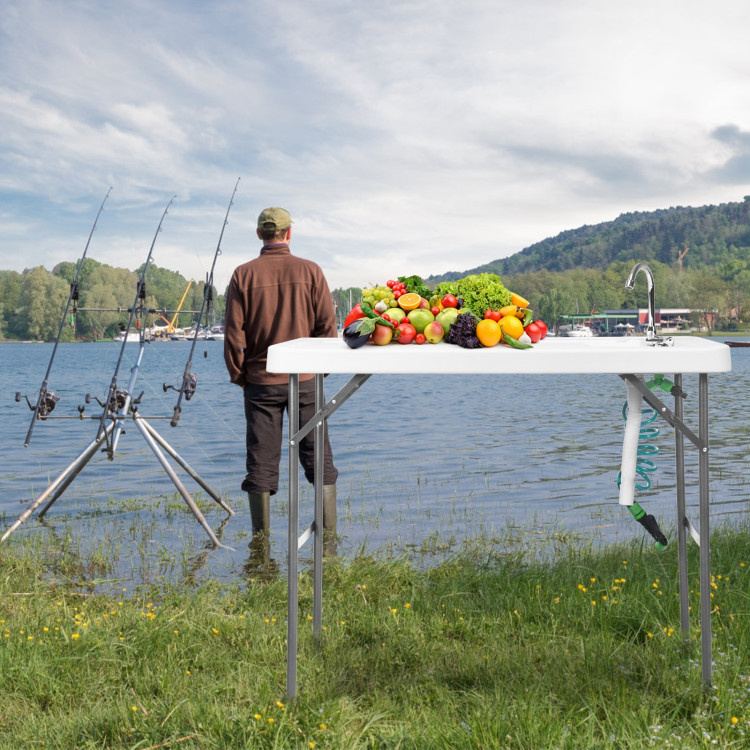 The quick-connect faucet is simple to set up and attach to a garden hose, & the extending sprayer gives you water pressure where you need it. With a durable sloped surface and integrated sink with drain, this table gives you the convenience of your kitchen in the great outdoors. The folding legs allow you to take this table anywhere.